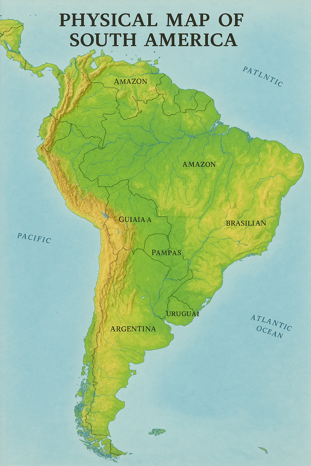 A Free Physical Map of South America clearly shows its diverse geography. The major mountain ranges dominate the west coast, showing huge peaks such as Ekonkagua, more than 7,000 km. The  East side is a huge Amazon basin, which is pulled out by the powerful Amazon River, the world’s largest by discharge, and its broad rainfall. Also, Sout, Brazil’s highland,s, and the Guana Highlands present the ancient plateau structures.
