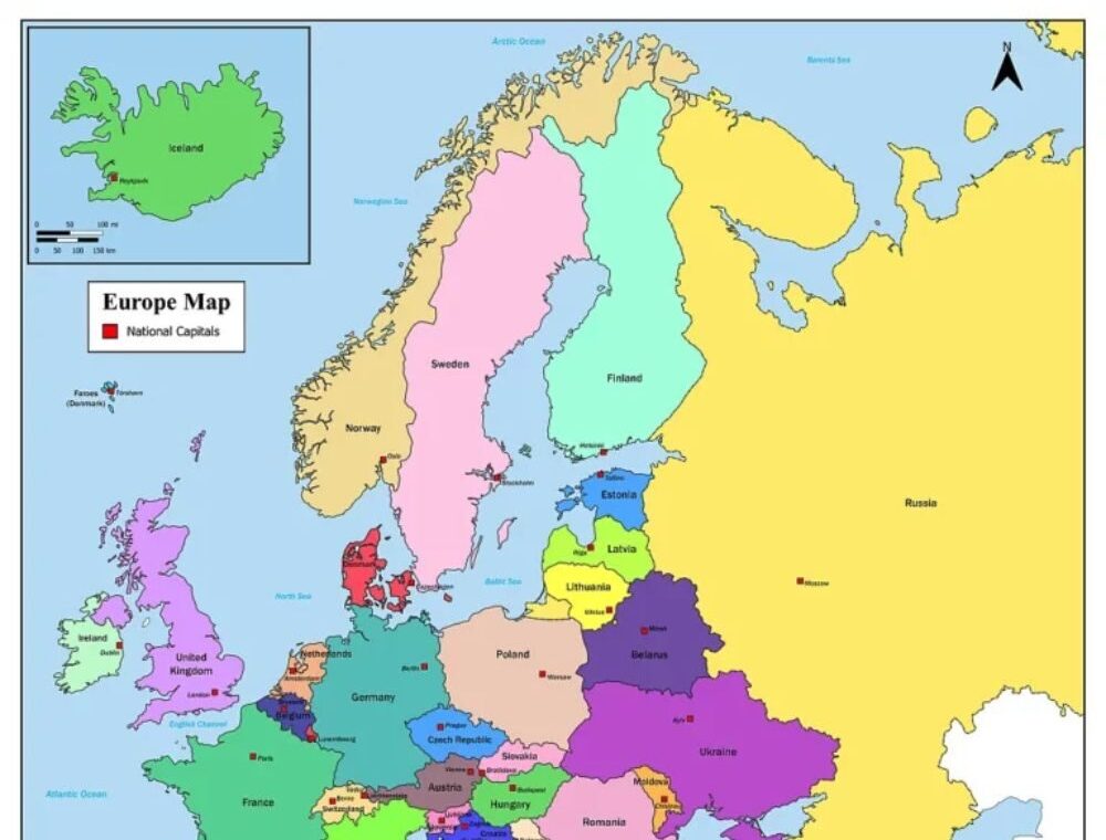 A Political Map of Europe is like a picture that shows all the countries in Europe and where they are. It does not show mountains or rivers – instead, it shows the boundaries between countries, their names, and capitals such as capitals. Each country is often of a different color, so we can easily tell them different. For example, we can see where France is, where Germany begins, or where Italy is located.